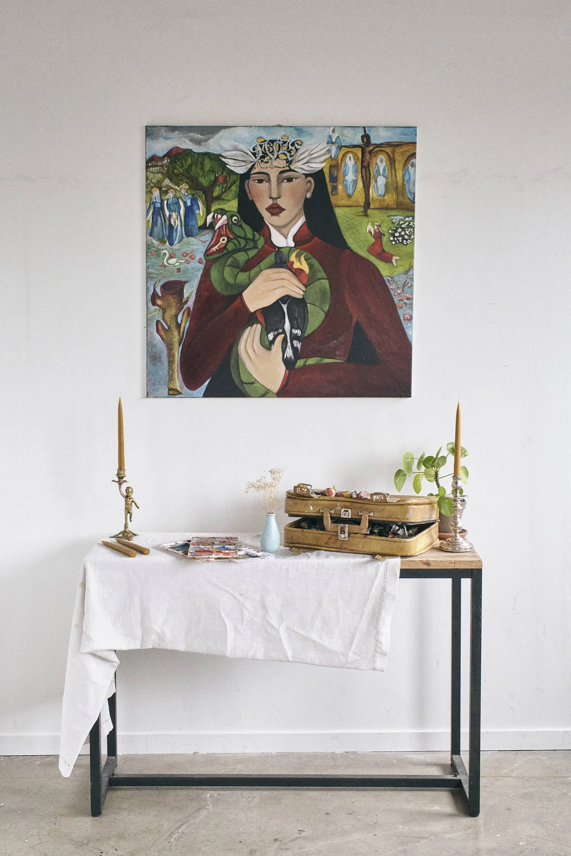 The serpent, traditionally associated with danger or transgression, loses its threatening power here. It becomes a recognized part of the self an aspect integrated rather than rejected. The rescued bird resting against her chest introduces a quiet gesture of care and protection. It acts as a companion, a witness to healing, and a reminder that gentleness toward oneself is an essential form of resilience.